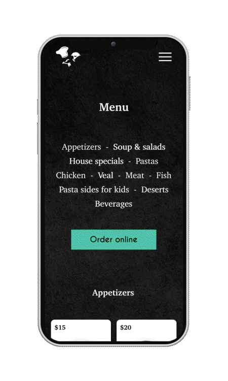Design a responsive website for customers to learn about the menu, be able to order online, see the location and hours of operation, see food pictures, and read stories about the restaurant.